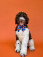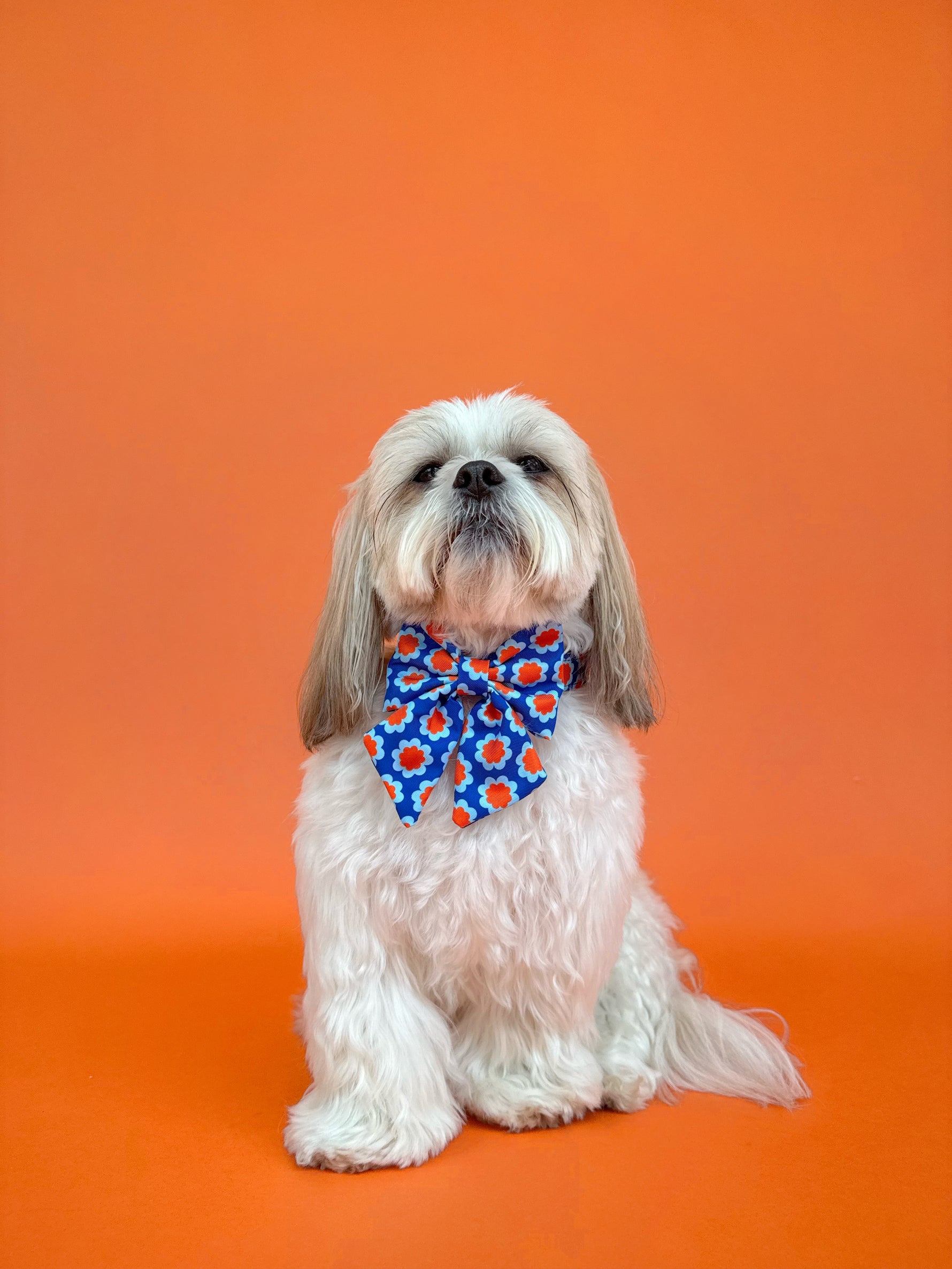 Bring a touch of Mediterranean magic to your pup’s style with our Sorrento Sailor Dog Bowtie! Featuring vibrant blue and orange geometric florals, this playful design adds a bold yet elegant flair to any look. With its charming hanging ribbons and lightweight feel, it’s the perfect accessory for pups who love to make a statement wherever they go.