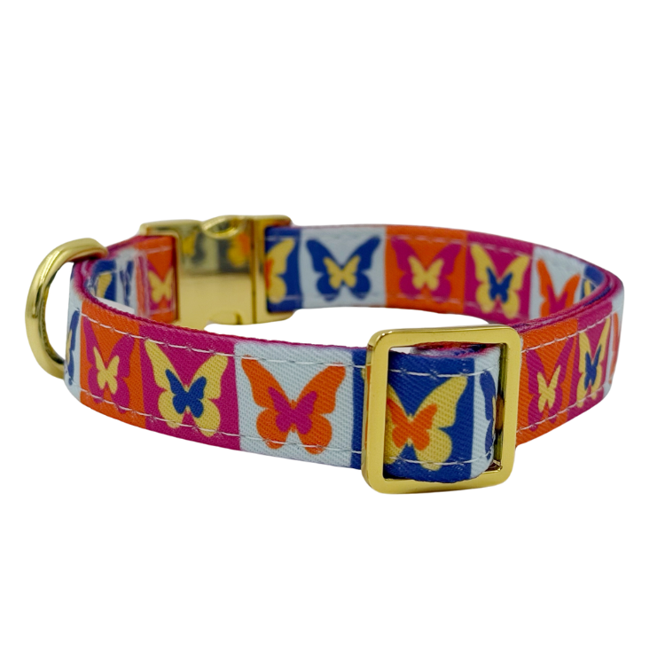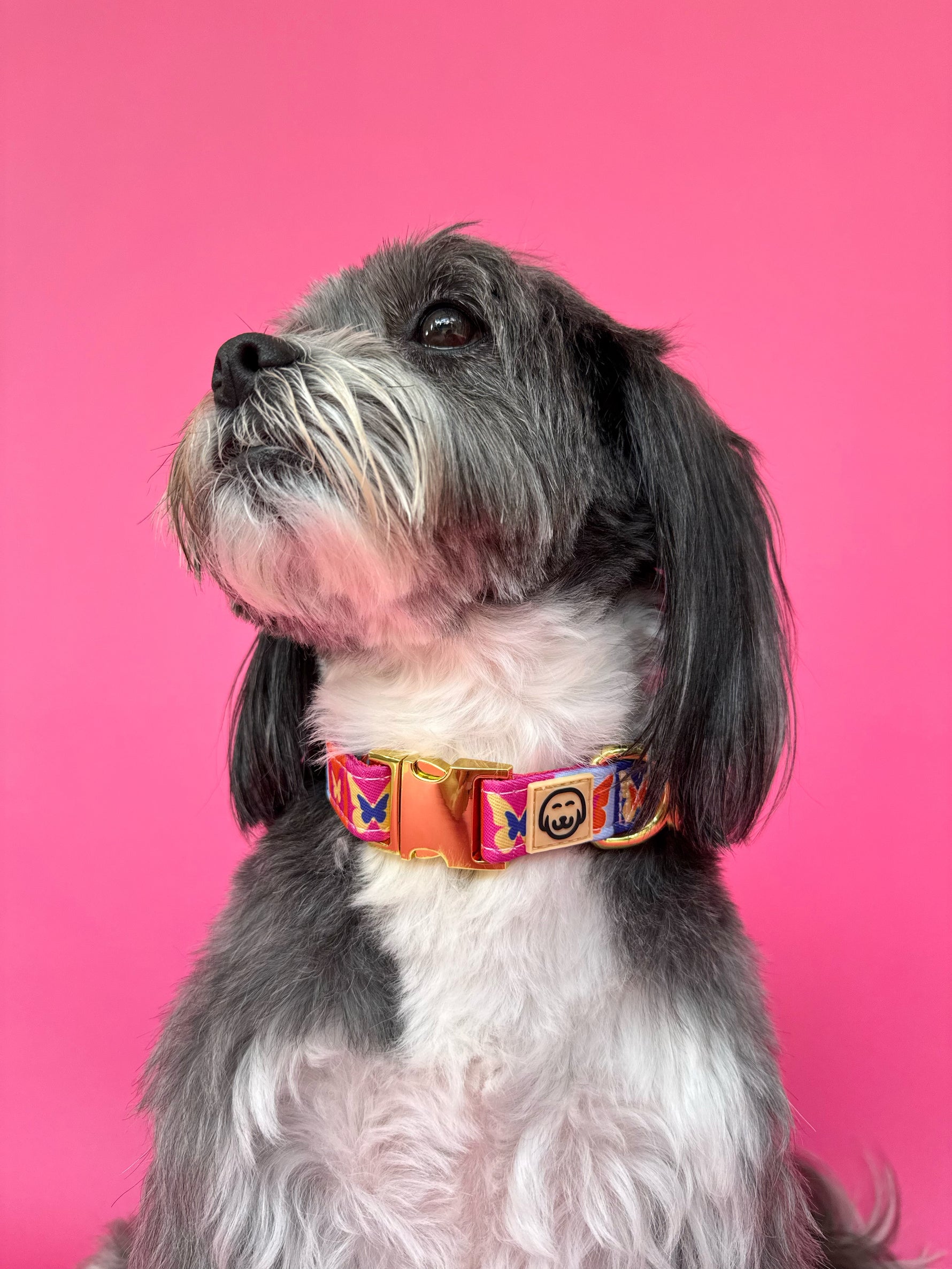 Elevate your pup’s style with our Mariposa Dog Collar! Adorned with a beautiful Molly & Co. original design, this collar brings a touch of elegance and whimsy to your dog’s everyday look, making every outing feel like a stroll through a garden.