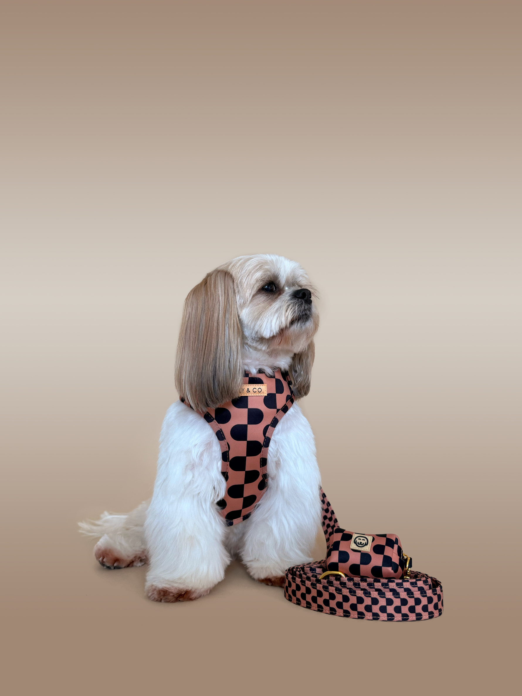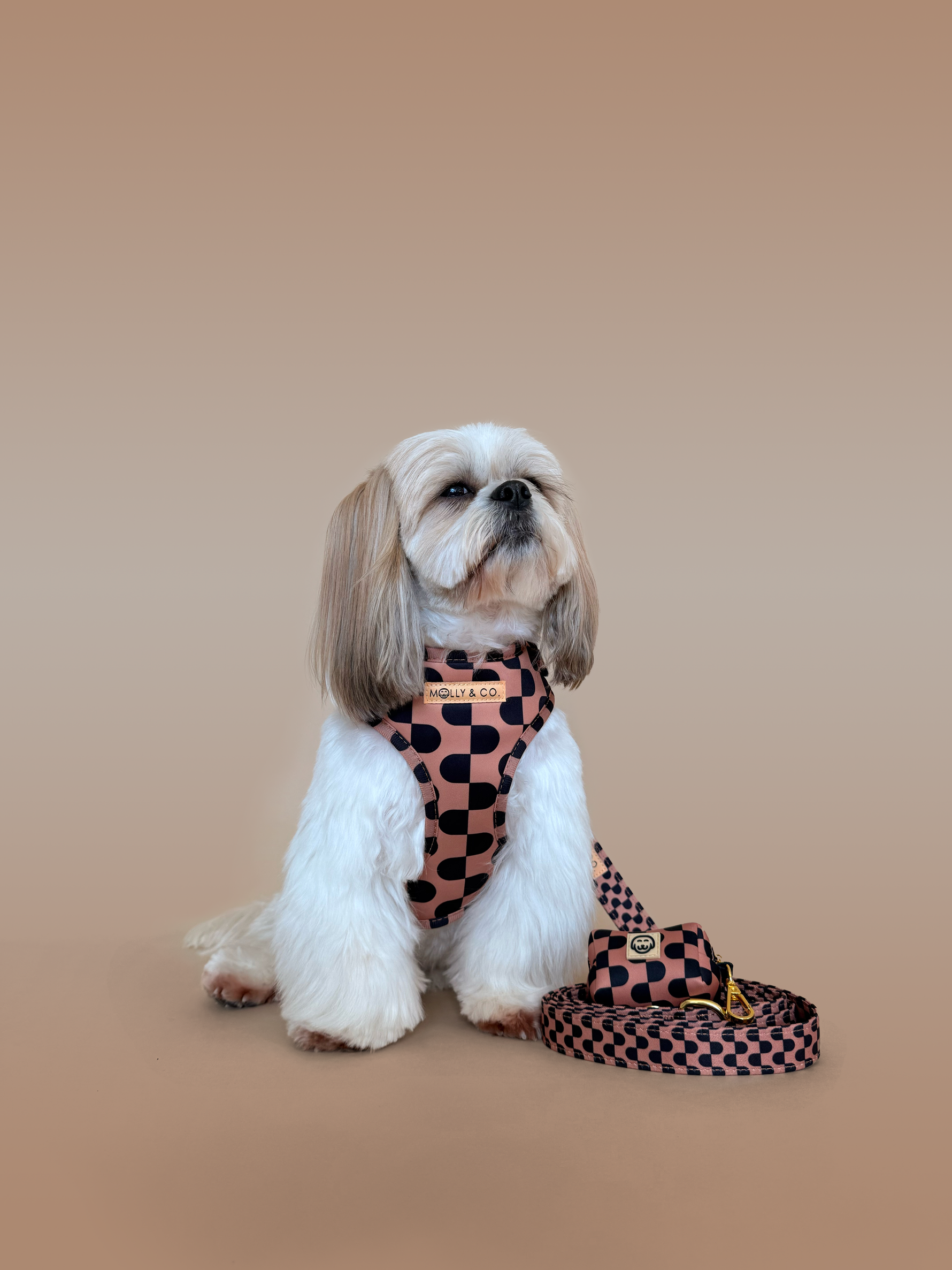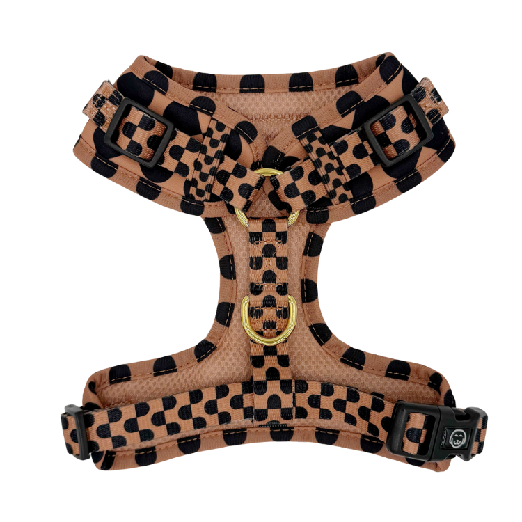 Meet the Moonrise Adjustable Dog Harness! A sleek, stylish classic for the dog who always looks put together. With its clean black-and-cream geometric pattern and signature gold hardware, this harness feels like a tailored blazer for your pup: timeless, polished, and effortlessly luxe on every walk.